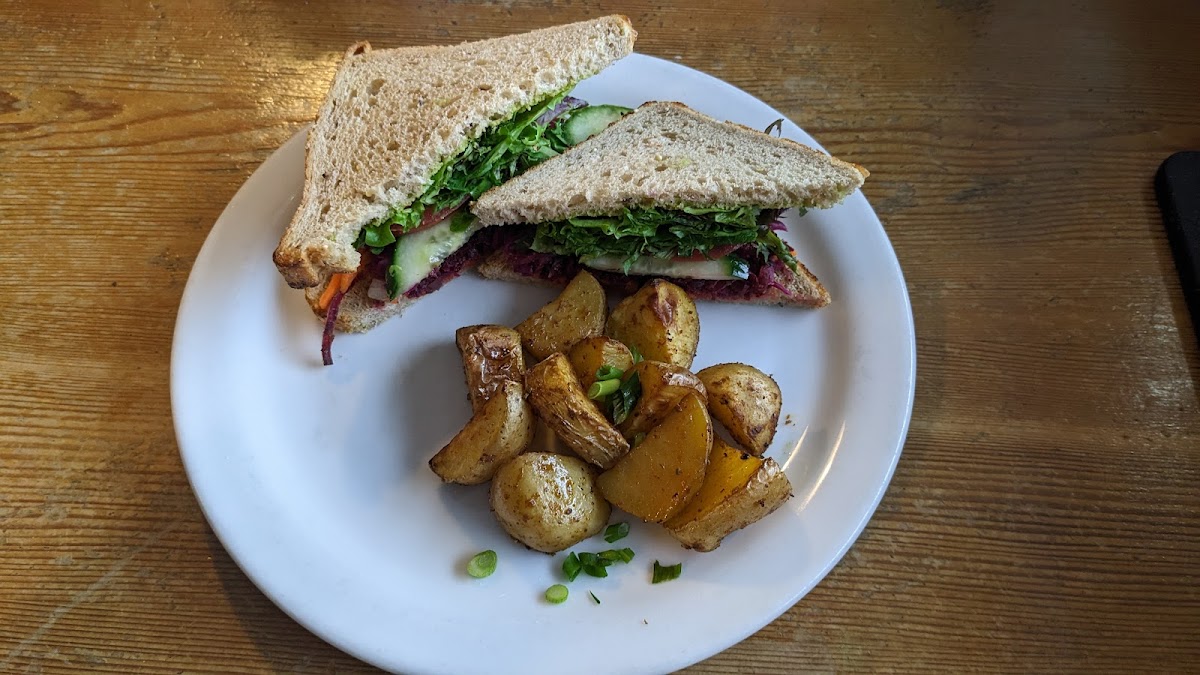 We absolutely loved this place. We came for breakfast three out of fours days (and regretted the one day we didn’t come!), everything was wonderful. Very chill vibe, great food, and tons of books and records to browse when you’re done :) They also have gluten free alternatives for pretty much anything on the menu - gf waffles and sandwich pictured here. Highly recommend!